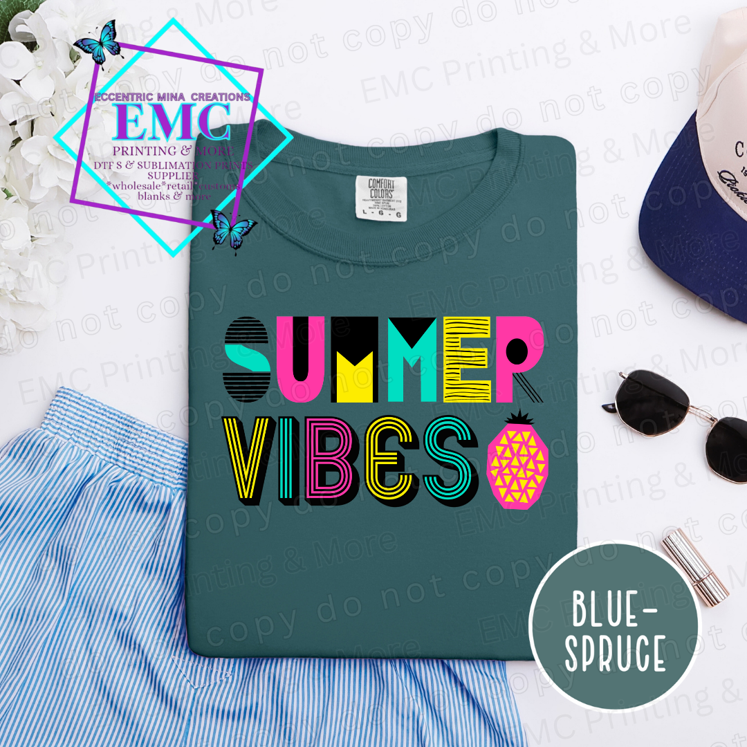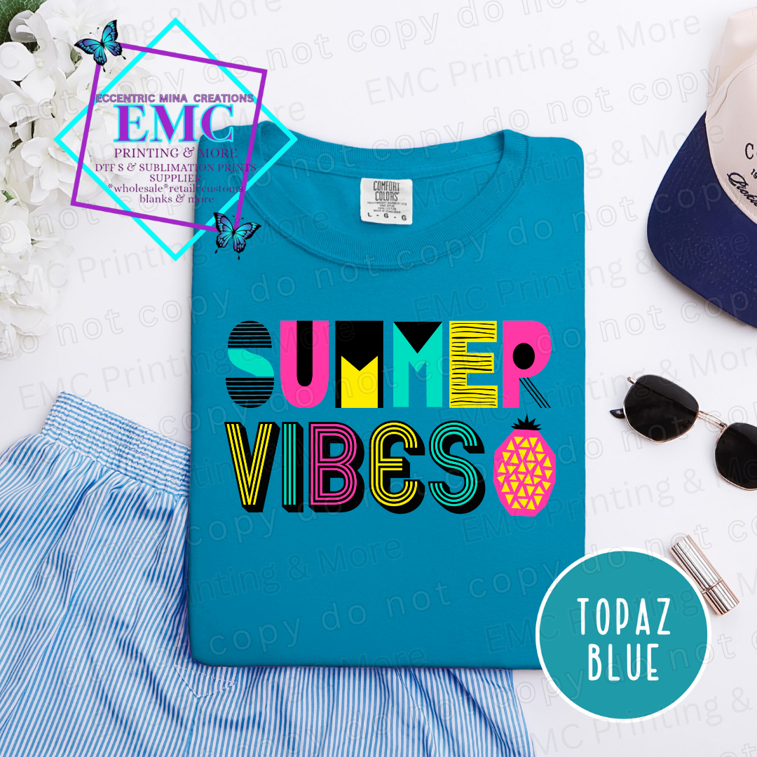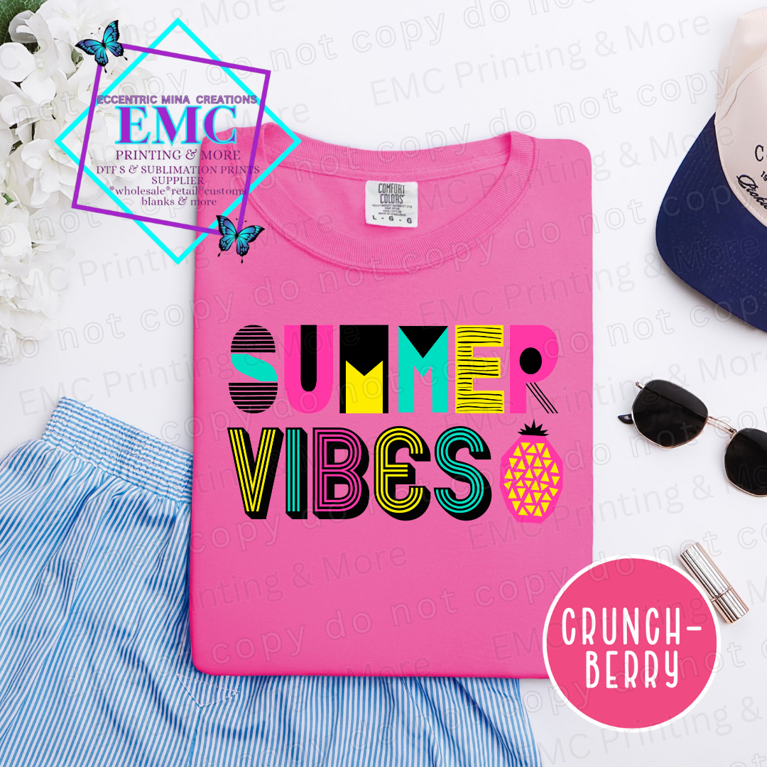 Get ready for some bright and bold "SUMMER VIBES" with this playful tee! Featuring colorful, chunky text with a cute little pineapple accent, this design is bursting with tropical energy. It's the perfect shirt to wear when you're ready to soak up the sun, enjoy some fruity drinks, and just let loose!