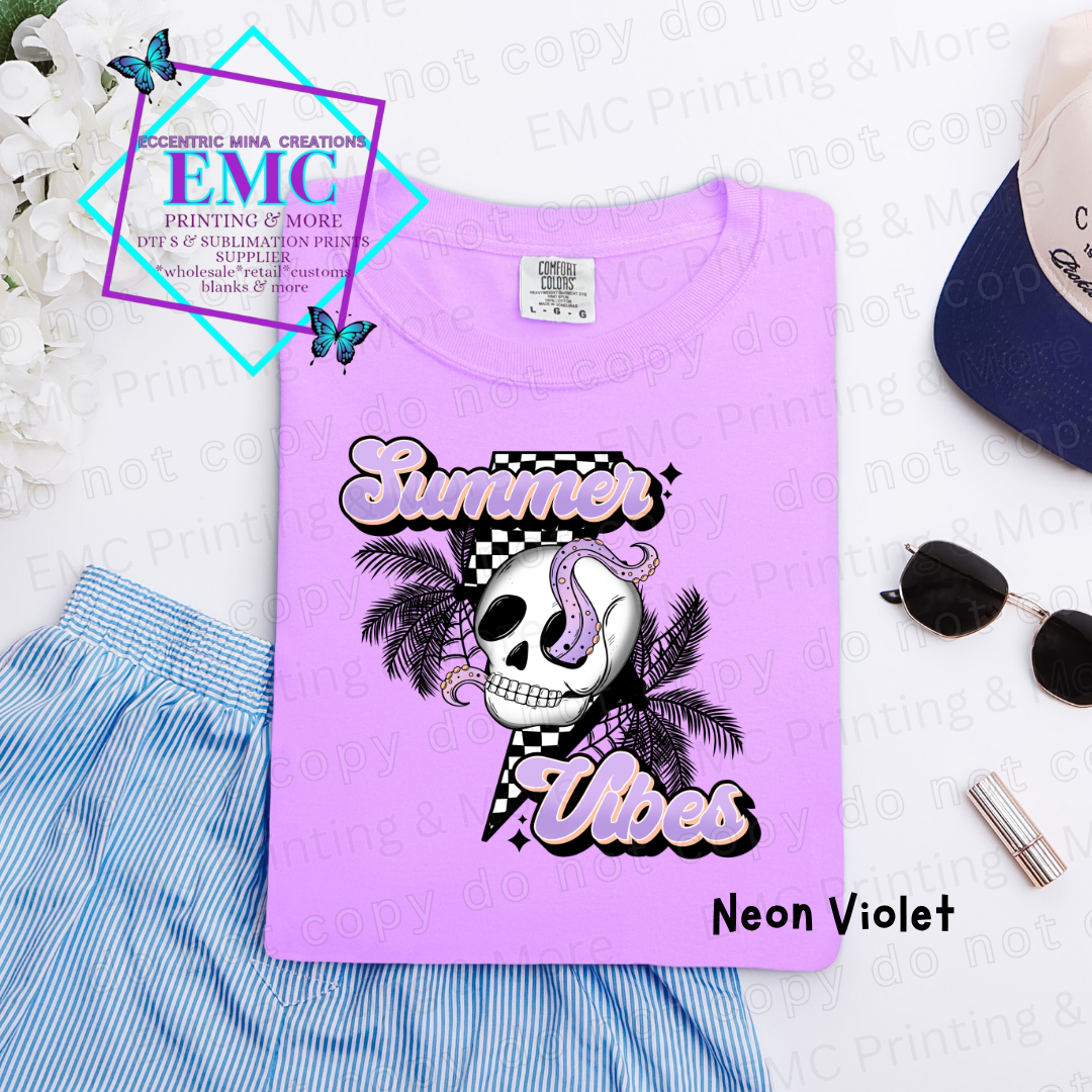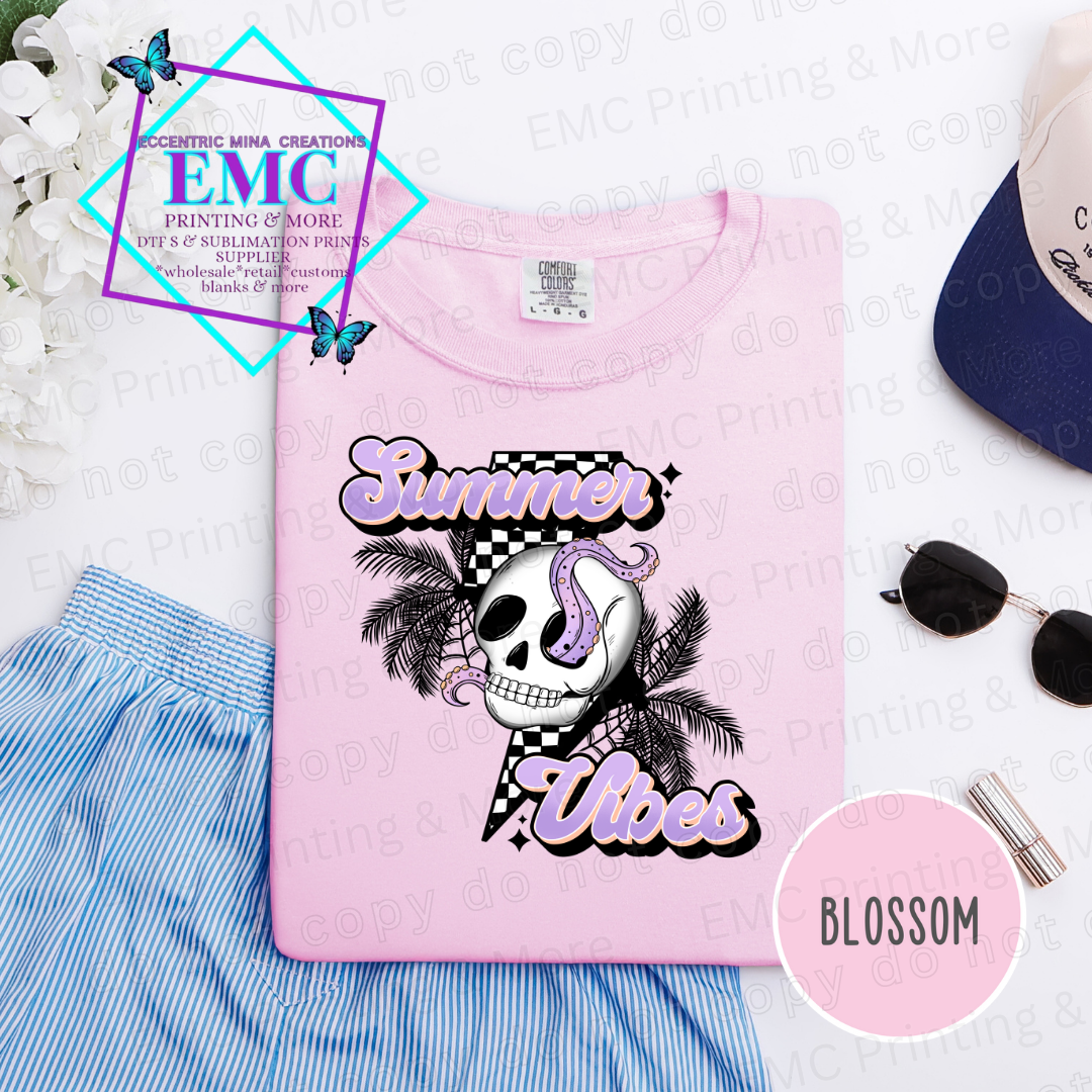 For those who like their summer with a side of edgy cool, check out our "Summer Vibes" design! This unique graphic features a skull with an octopus tentacle peeking out, surrounded by palm trees and a retro checkered pattern. It's a fun, quirky, and slightly spooky twist on classic beach vibes, perfect for standing out!