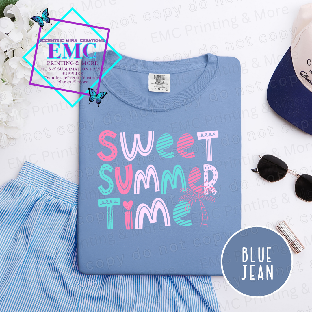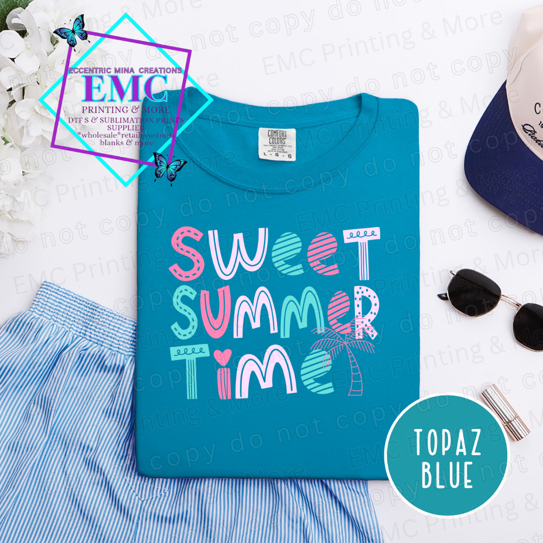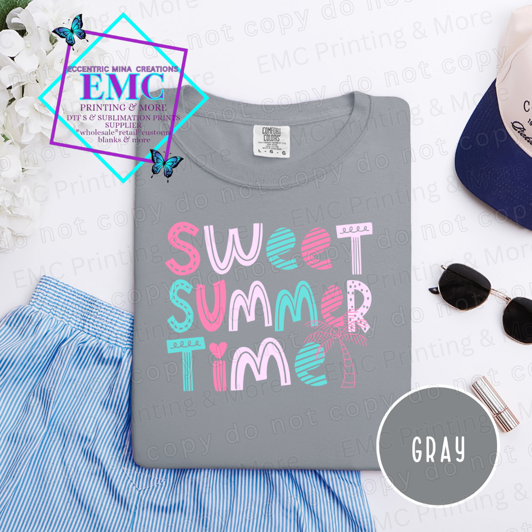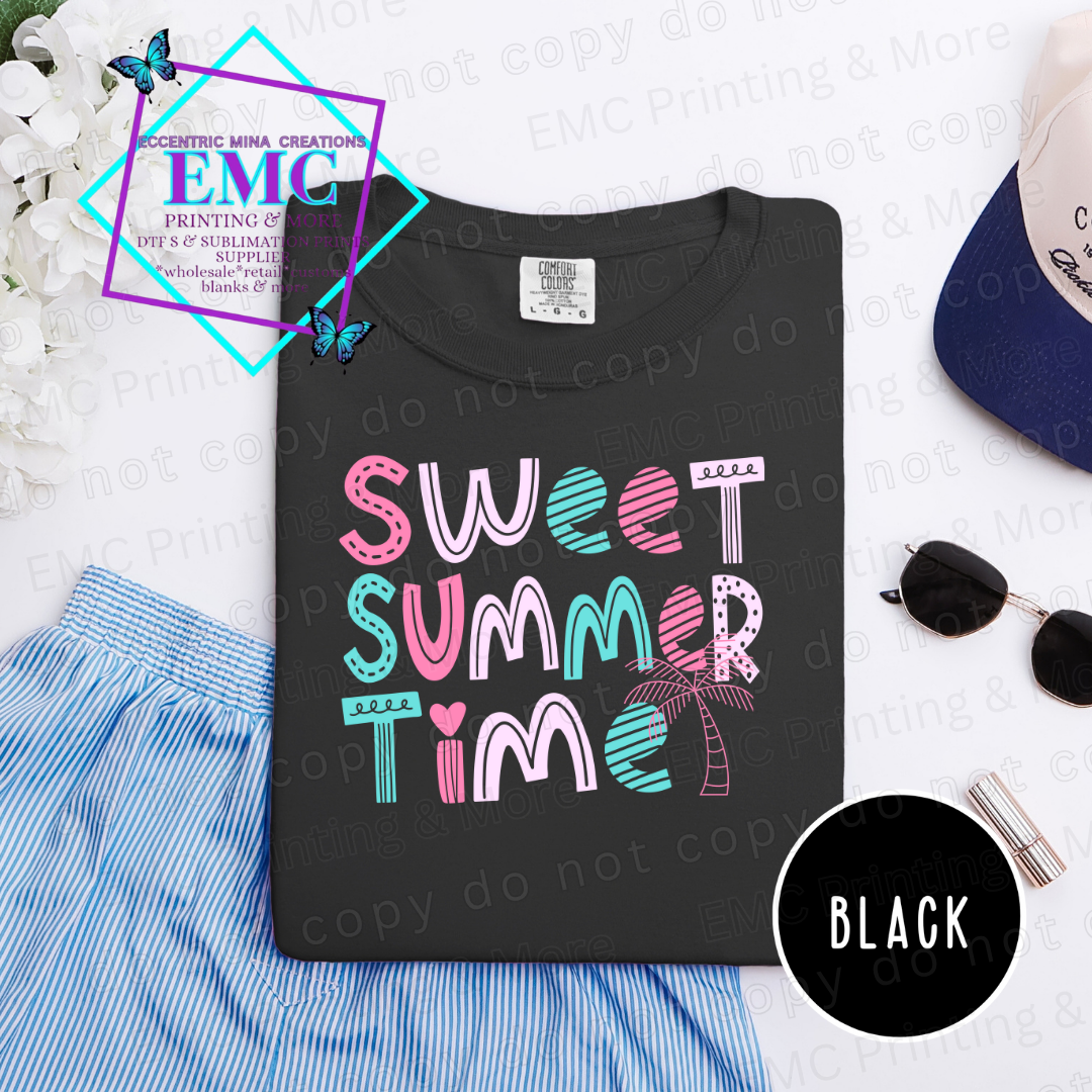 Get ready for "SWEET SUMMER TIME" with this adorable design! Featuring playful, colorful lettering with fun textures and a cute little palm tree accent, it perfectly captures the blissful, relaxed essence of the season. It's the ideal tee for sunny days and sweet memories!
