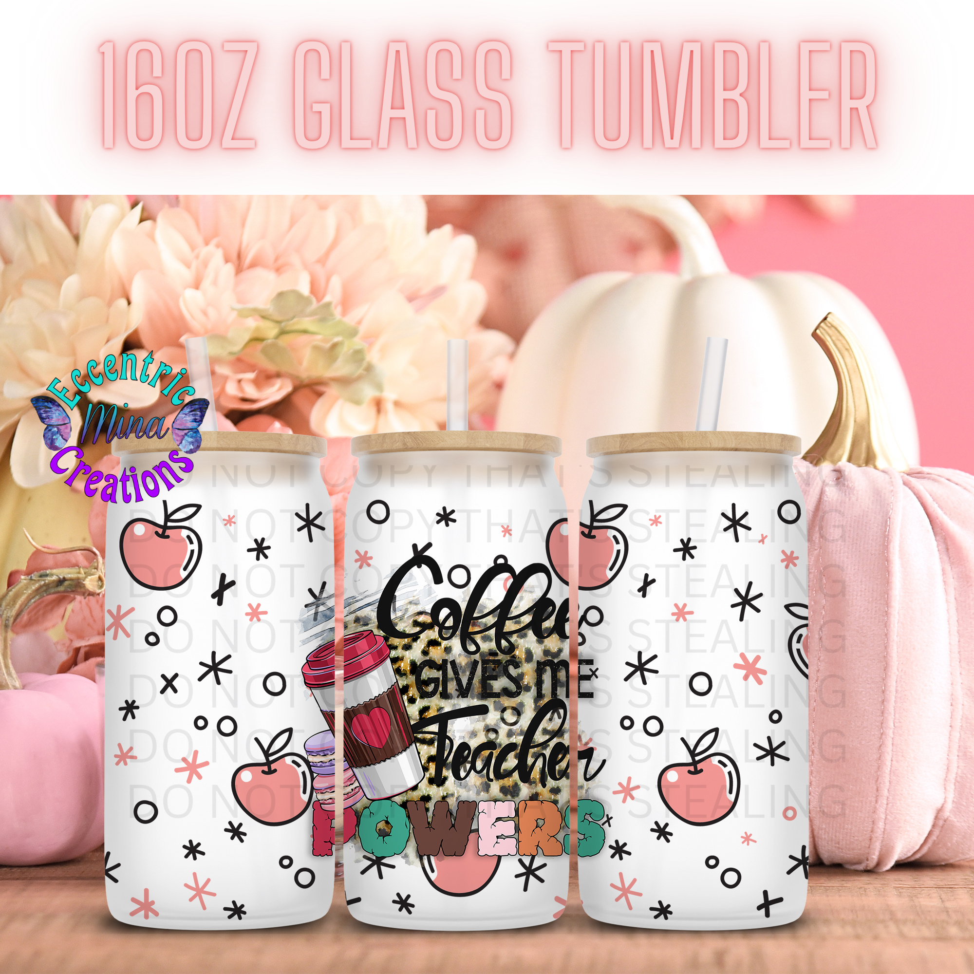 This 16oz Libby glass tumbler featuring "coffee gives me teacher powers" is ideal for any teacher looking to upgrade their beverage game. Crafted from glass, this tumbler ensures long-lasting durability and a classic style perfect for a morning cup of coffee. Make your teacher routine even more special with this stylish tumbler.